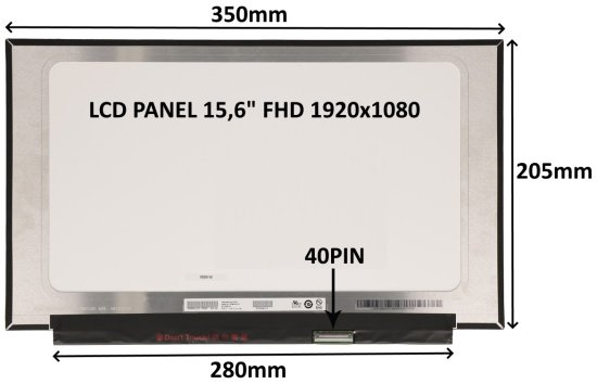 Diagonala: 15,6" Rešljivost: 1920×1080 FHD konektor: 40 PIN Tip osvetlitve ozadja: LED Površina plošče LCD: matirana Tehnologija plošče LCD: IPS Mere: Širina:350 mm Višina: 205 mm Dolžina pretvornika: 280 mm Način pritrditve plošče LCD: brez nosilcev – prilepljena na pokrov LCD garancija: 24 mesecev tudi za okvarjene piksle