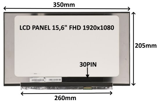 Diagonalni: 15,6" Rešljivost: 1920×1080 FHD konektor: 30 PIN Trip osvetlitve ozadja: LED Površina plošče LCD: MATNA Tehnologija plošče LCD: IPS Mere: Širina:350 mm Višina: 205 mm Dolžina pretvornika: 260 mm Način pritrditve plošče LCD: brez nosilcev – prilepljena na pokrov LCD Garancija: 24 mesecev tudi za okvarjene piksle