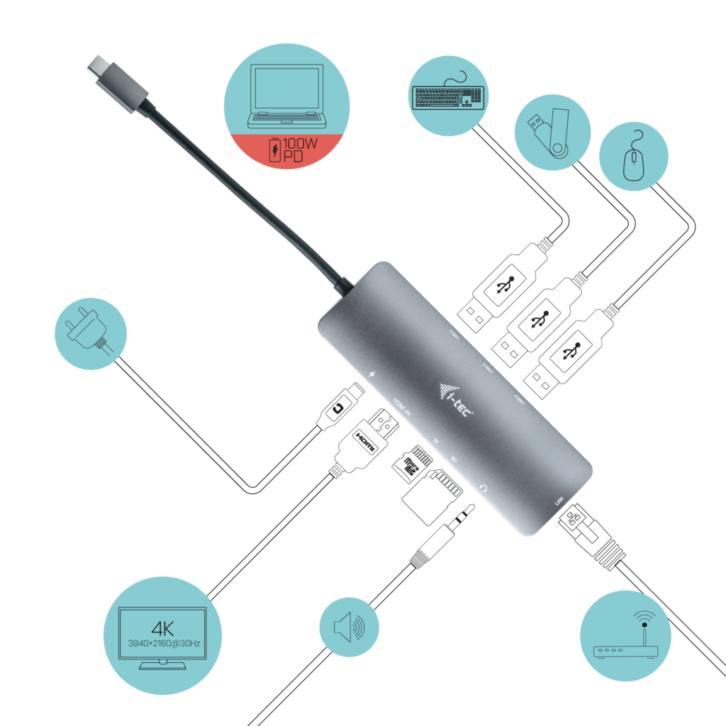 i-Tecova kovinska priklopna postaja USB-C Metal Nano ponuja preprost in praktičen način za razširitev ponudbe vrat prenosnega računalnika. S priključkom HDMI s podporo za izhodne ločljivosti do 4K Ultra HD lahko enostavno razširite namizje z zunanjim monitorjem, televizorjem HDMI ali celo projektorjem.