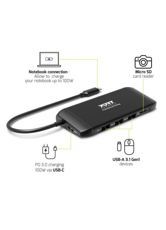 3× USB-A 3.1 Gen1 s hitrim prenosom podatkov do 5 Gb/s 1× USB-C 3.0 Power Delivery do 100 W 1× vrata RJ45: 10/100/1000 Mb/s Ethernet 2× bralnik kartic: SD, micro SD Dimenzije in teža: 5,5 × 1,7 × 12,4 cm / 100 g Dimenzije in teža paketa: 8 × 19 × 2,4 cm / 180 g Material: ABS + PCBA