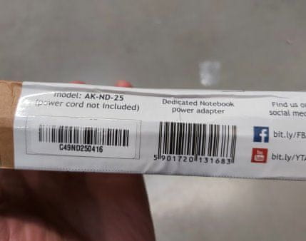 Koda izdelka AK-ND-25 Vrsta izdelka Napajalnik AC/DC Združljiv s HP / Compaq Napajalna napetost 100–250 V Poraba energije < 2,4 A Učinkovitost > 80 % Izhodna napetost 19,5 V Izhodni tok 3,33 A Dolžina izhodnega kabla 1,2 m Izhodni priključek 4,5 × 3,0 mm + zatič Največja izhodna moč 65 W Napajanje IEC C6 Ozemljitev Mehki zagon OVP OCP OPP OTP SCP Material ABS Barva izdelka črna Barva osvetlitve zelena LED MTBF 100000 h Temperatura 5 – 50 °C Embalaža EcoBox Velikost izdelka (d x š x v) 114 × 49 × 30 mm Velikost paketa (d x š x v) 190 × 90 × 38 mm Neto teža 200 g Izjava o skladnosti CE Skladnost FCC Skladnost z RoHS Skladnost z uredbo REACH