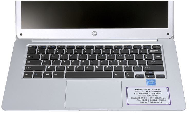 Močan, energijsko varčen in zmogljiv procesor Intel Cherry Trail Z8350 Quad Core, ki deluje s frekvenco do 1,92 GHz, zagotavlja dovolj procesorske moči za večopravilnost. Ta izjemno pomemben del opreme odlično sodeluje z vgrajenih 2GB pomnilnika, ki zagotavlja nemoteno delovanje pri predvajanju večpredstavnostnih sporočil ali odpiranju več strani v spletnem brskalniku. Procesor Atom zagotavlja visoko zmogljivost, a tudi energetsko učinkovitost. Izredno zmogljiva baterija vam omogoča, da boste lahko delali brez skrbi tudi ko ni električnega napajanja pri roki. Stilsko dovršen prenosnik, ki je hkrati lahek in tanek, debelina zaprtega prenosnega računalnika namreč meri samo 19 mm, bo postal vaš odličen sopotnik.