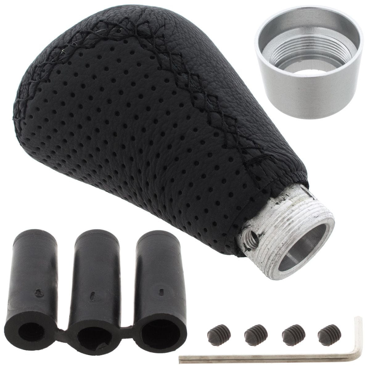 Artikel: UNIVERZALNA ROKA MENJALNIKA Avto: veliko modelov (univerzalna uporaba) Barva: črno usnje + SILVER (mat krom) tulec na dnu gumba Shema: črn pokrov z belo shemo 5 prestav + vzvratna Proizvajalec: zamenjava Tehnično stanje: artikel je NOV, neuporabljen, nepoškodovan in nepoškodovan OPOMBA! V kompletu so 3 zamenljivi adapterji za palico z navojem: M6, M8 in M12 premer montažne luknje gumba je 15 mm (brez adapterjev) višina gumba je 92 mm
