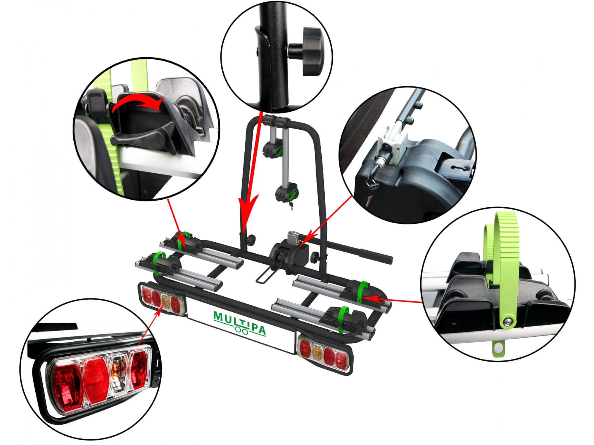 Nosilec za kolesa, kompakten in enostaven za uporabo, za vgradnjo na vlečno kljuko za vse vrste koles s popolnoma osvetljeno rampo in prostorom za registrsko tablico. Pritrditev kolesa na nosilec je mogoča popolnoma brez orodja, le pritrdite nosilec na okvir in privijte zaponko kolesa, ki se nahaja na dnu. Mehanizem je mogoče zakleniti in preprečuje krajo koles. Nosilec je izdelan iz jekla, vsaka podlaga za kolesa pa iz srebrnega aluminija. Stojalo za kolesa je primerno za dva kolesa, katerih skupna teža ne presega 60 kg. Stojalo za vlečno kroglo je nameščeno na odobreni vlečni napravi s kroglo ISO 50. Nosilec za kolesa je namenjen prevozu koles. Prevoz drugih predmetov ni dovoljen. Zavarovan je z robustno ročico in ključavnico. Klančina zadnje luči je s 13-polnim vtičem povezana z vtičnico vlečne opreme vozila in je opremljena s celotnimi zadnjimi svetilkami, vključno z lučmi registrske tablice.