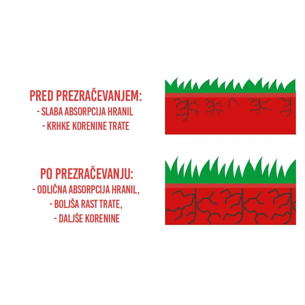 Osrednja nastavitev delovne višine v 5 korakih od –12 do + 6 mm, vam omogoča prilagoditev globine prezračevanja glede na potrebe vaše trate. To pa pripomore k boljši absorpciji vode in hranil.