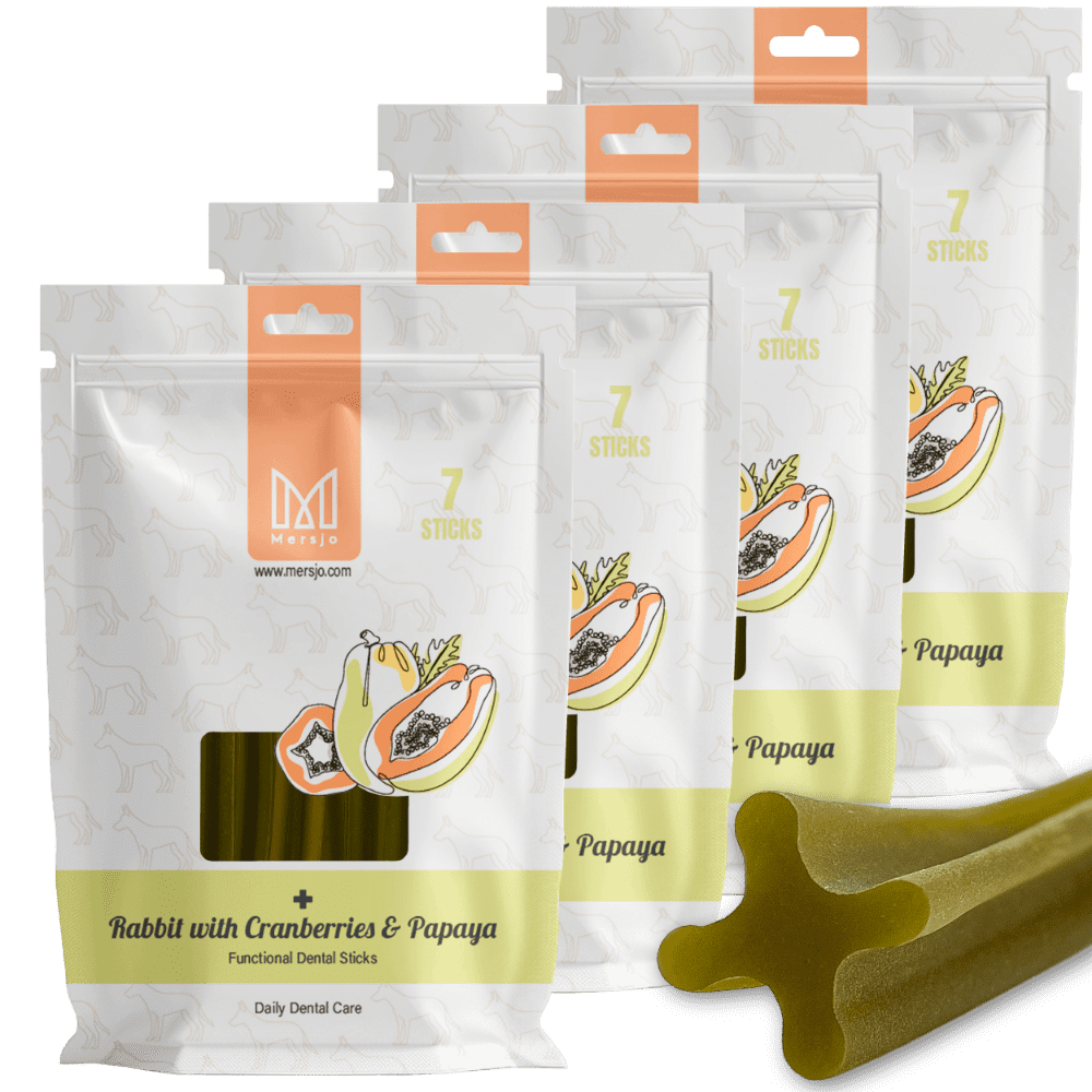 Mersjo Zobni priboljšek za pse Mersjo Dental Sticks - Zajec Papaja & Brusnica (28 palčk)