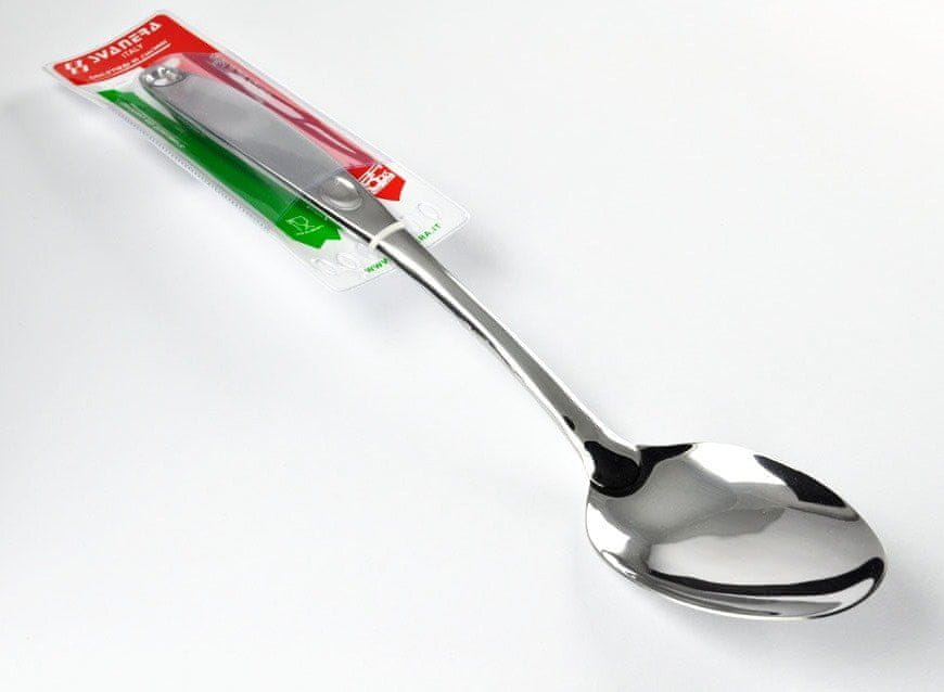 Visokokakovostna servirna žlica iz nerjavnega jekla 18/C z zanko za obešanje, skupna dolžina 36 cm, širina 7 cm. Primerna za pomivalni stroj. Italijanski proizvajalec. EAN 8005498016863