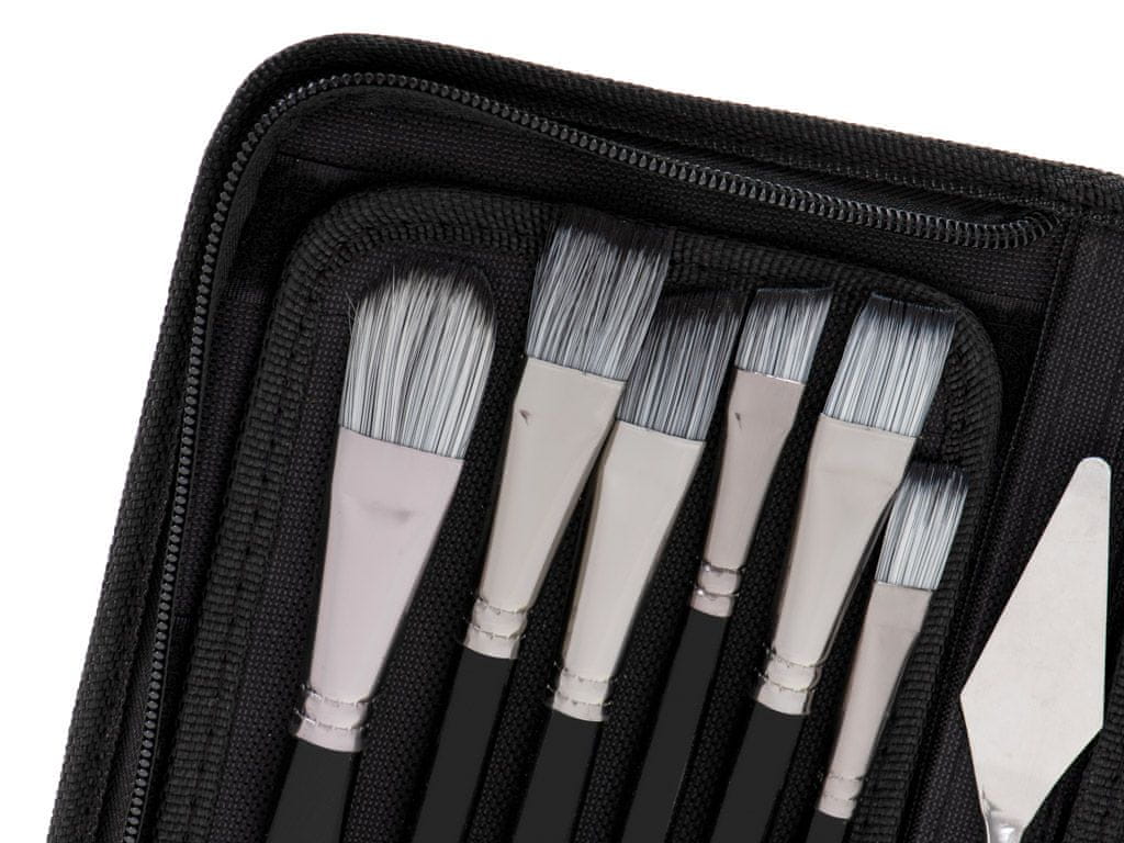 UMETNIŠKI ČOPIČI V KOVČKU Velik komplet čopičev in likovnih pripomočkov za različne vrste barv. Zagotavljajo natančno in gladko prekrivnost pri barvanju. Konice različnih debelin bodo olajšale ustvarjanje zahtevnejših oblik. Tanki čopiči vam bodo omogočili, da izboljšate svoje delo v vsaki podrobnosti. Čopiči so označeni s številko za lažjo izbiro prave velikosti. V kompletu sta tudi lopatka in gobica, ki vam olajšata barvanje z različnimi tehnikami. Popolne so za začetek vaše slikarske avanture. Dobre barve niso vse. Enako pomembni pri ustvarjanju so dobri čopiči, s katerimi bo slikanje postalo fantastična dogodivščina. Ščetine čopiča so izdelane iz sintetičnih vlaken. Lesen ročaj ni le impresivnega videza, ampak tudi olajša držanje čopiča v roki. Čopiči so tudi enostavni za čiščenje. Po končanem delu jih preprosto operete v mlačni vodi, brez dodajanja detergenta. Uspešno jih lahko uporabljamo pri likovnem pouku v šoli ali pri ustvarjanju doma. V kompletu je do 15 čopičev različnih debelin, ki olajšajo ustvarjanje tudi najbolj prefinjenih umetnin. Popolna ideja za darilo za vsakega umetnika. Vse skupaj je zapakirano v estetski etui z zadrgo, ki se odlično obnese kot peresnik. Vsebina seta: 15 čopičev različnih debelin, goba, lopatica za barvanje, material ščetin: najlonska volna, mere: premer gobe: 7 cm, dimenzije lopatice: 2,5 cm x 6 cm x 20 cm, dolžina čopiča: 19,5 cm –22,5 cm, dimenzije etuija (embalaže): 27 cm x 14 cm x 3 cm .