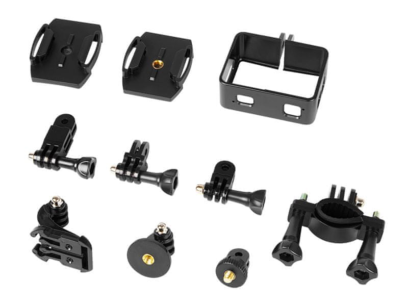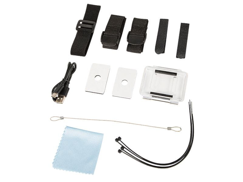 V kompletu so različni nosilci, s katerimi lahko kamero preprosto pritrdite na čelado, motorno kolo ali kolo. Ojačano ohišje ščiti fotoaparat pred mehanskimi poškodbami med ekstremnimi športnimi dejavnostmi.