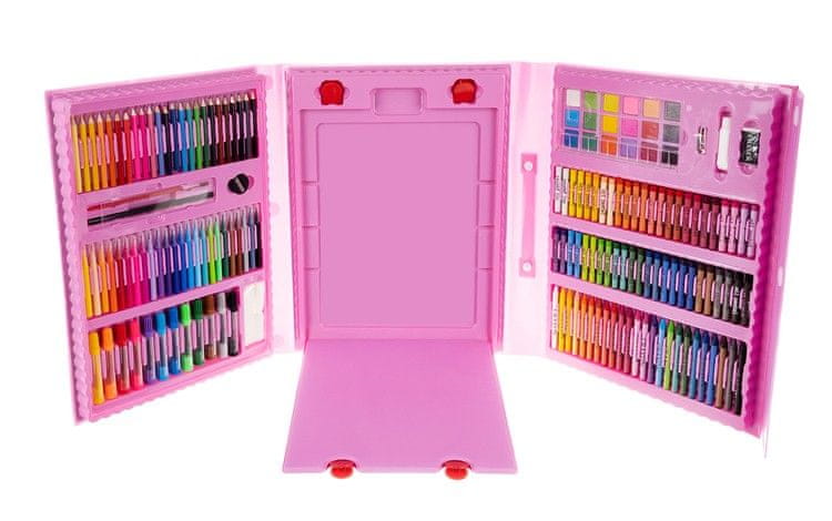XXL LIKOVNI SET Z 208 ELEMENTI V PRAKTIČNEM KAVIČKU ? Likovni set za otroke je na voljo v praktičnem kovčku z izvlečki, ki ima 3 zapirala na velcro in priročen ročaj. Zaradi tega je prenašanje kovčka udobno in zelo enostavno, vsebina pa se ne pretrga. Celoten opis