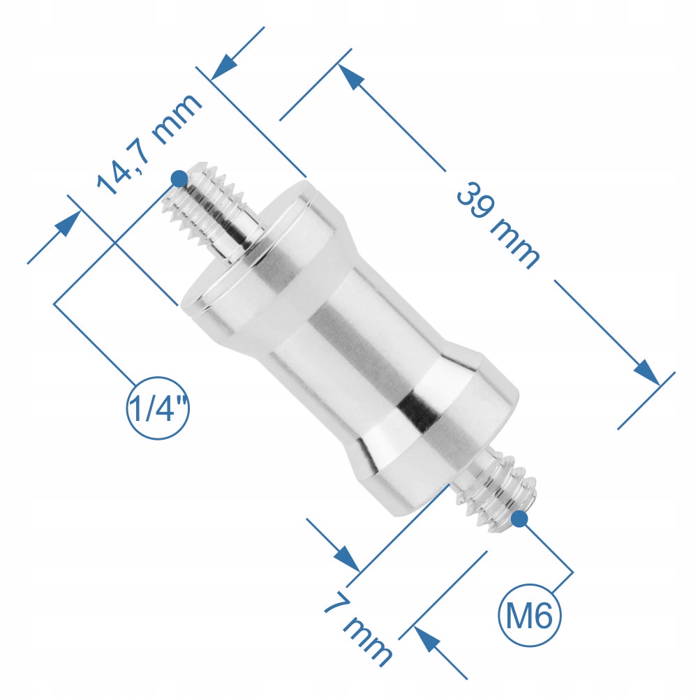 Adapter 1/4" na M6 iz lahkega aluminija. Omogoča povezavo dveh elementov z navojem 1/4" in M6. Primeren za fotografske stative in stojala za studijske svetilke in dežnike.