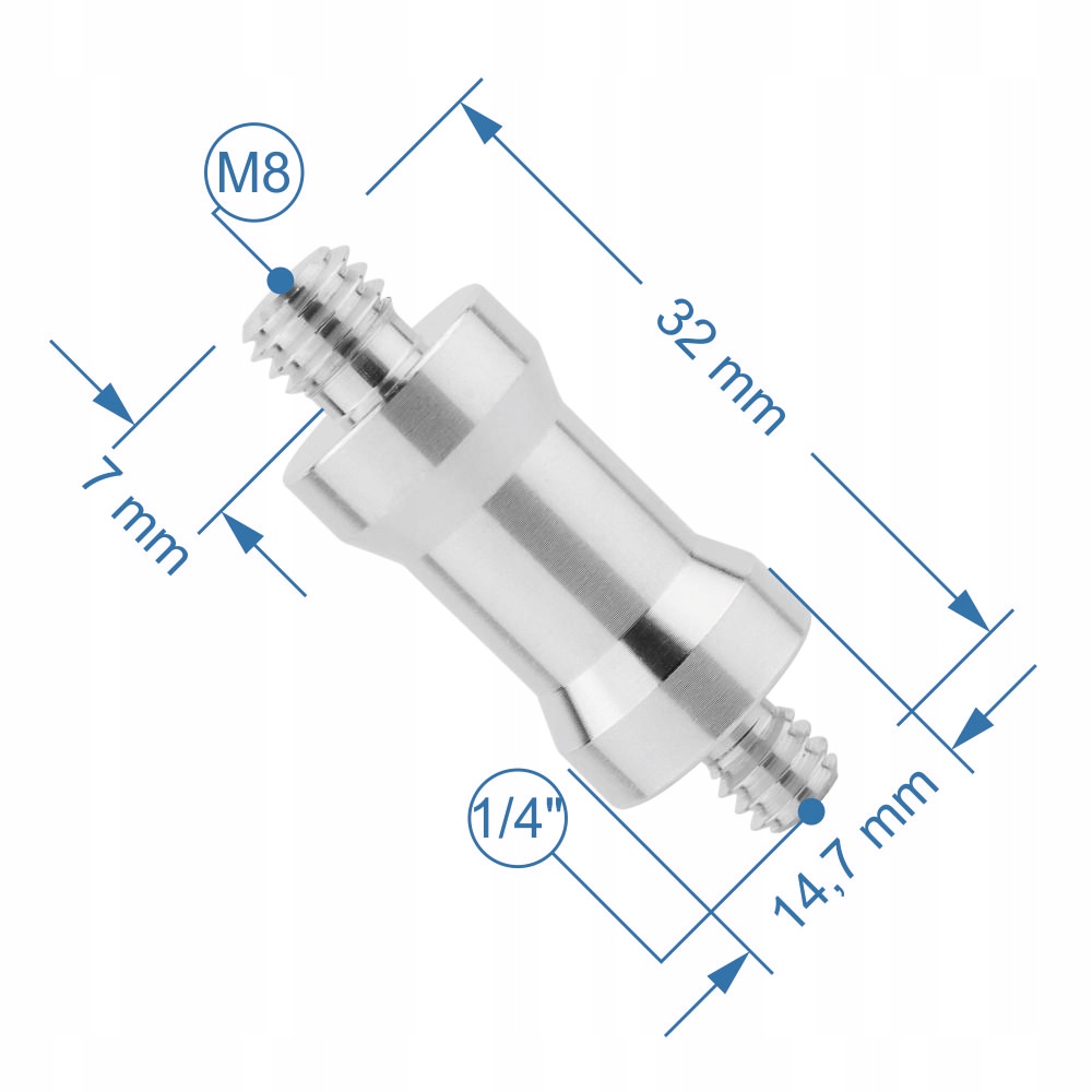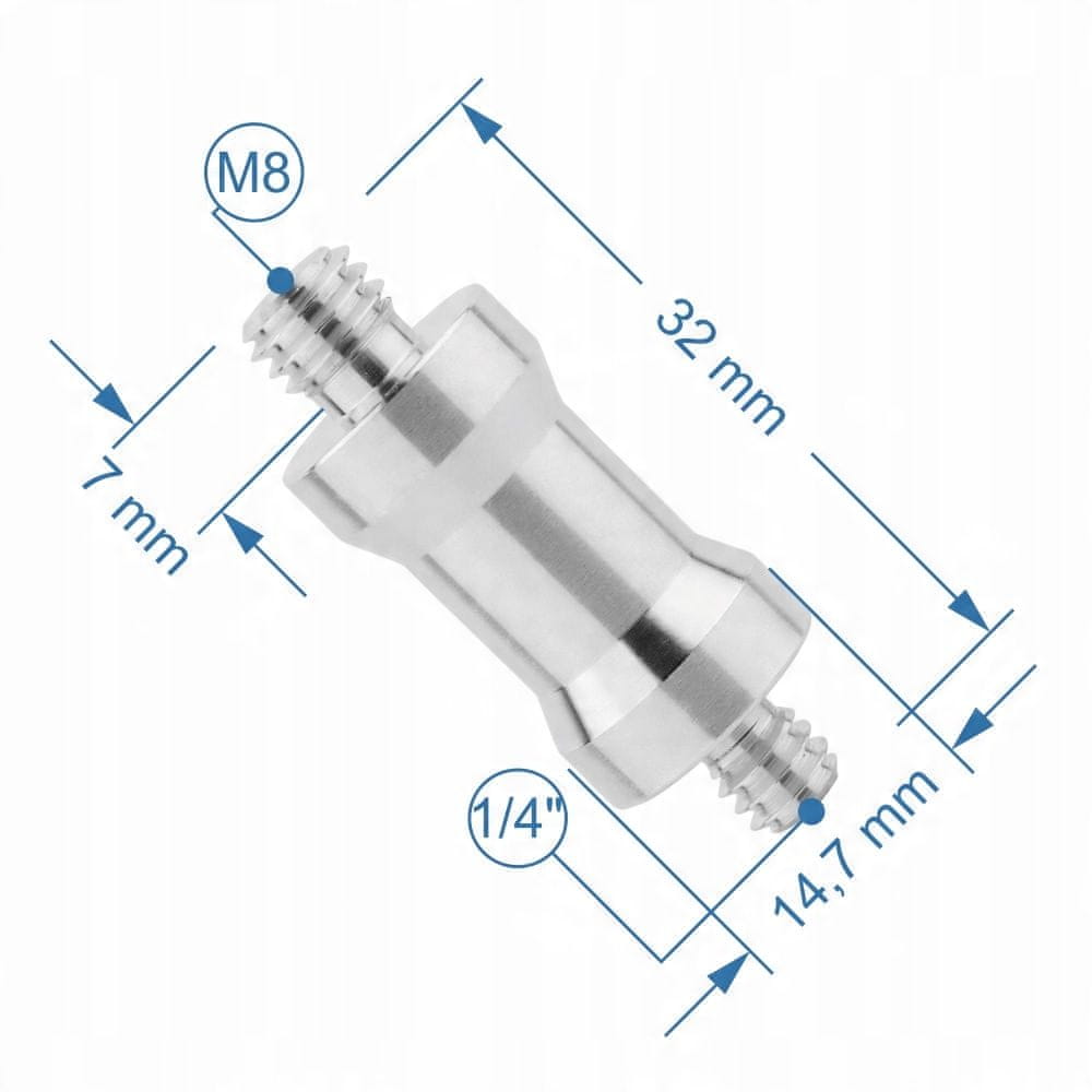 Adapter 1/4" na M8 iz lahkega aluminija. Omogoča povezavo dveh elementov z navojem 1/4" in M8. Primeren za fotografske stative in stojala za studijske svetilke in dežnike.