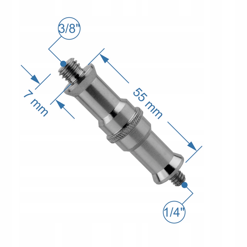 Adapter z redukcijskim tulkom 1/4" na 3/8" iz jekla. Omogoča priključitev elementov z zunanjim navojem 1/4" in 3/8". Idealen za foto-video uporabo in studijske nosilce.