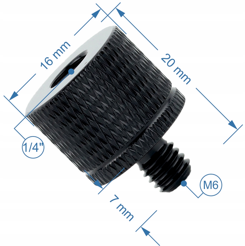 Aluminijast adapter M6 na 1/4" z narebričeno površino. Omogoča priključitev elementov z moškim in ženskim M6. 1/4" navoj v fotografski, studijski in tehnični opremi.