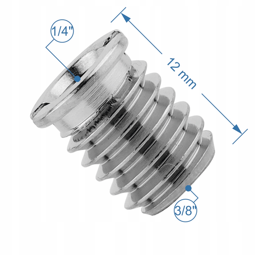 ✅ Navoj 3/8" – 1/4" – omogoča pretvorbo zunanjega navoja 3/8" v notranji navoj 1/4", ki se pogosto uporablja v fotografski in avdio-video opremi.