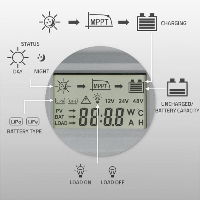 Krmilnik uporablja tehnologijo MPPT za sledenje največje moči, ki maksimizira energetsko učinkovitost z omogočanjem optimalne izrabe sončne energije . To omogoča sistemu , da nenehno spremlja in prilagaja napetost in tok iz fotonapetostnih panelov , da zagotovi največjo moč. To napredno upravljanje energije omogoča sončnim panelom , da dosežejo najvišjo možno učinkovitost, tudi v spreminjajočih se vremenskih razmerah, kot so delna senca ali spremembe intenzivnosti sončne svetlobe.