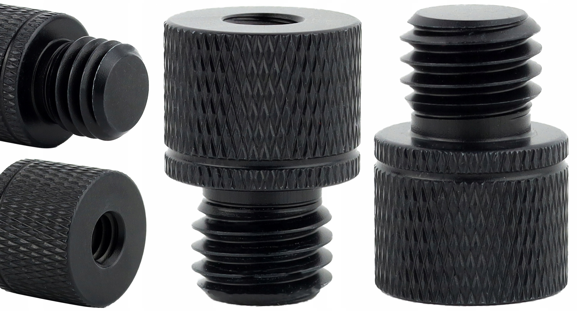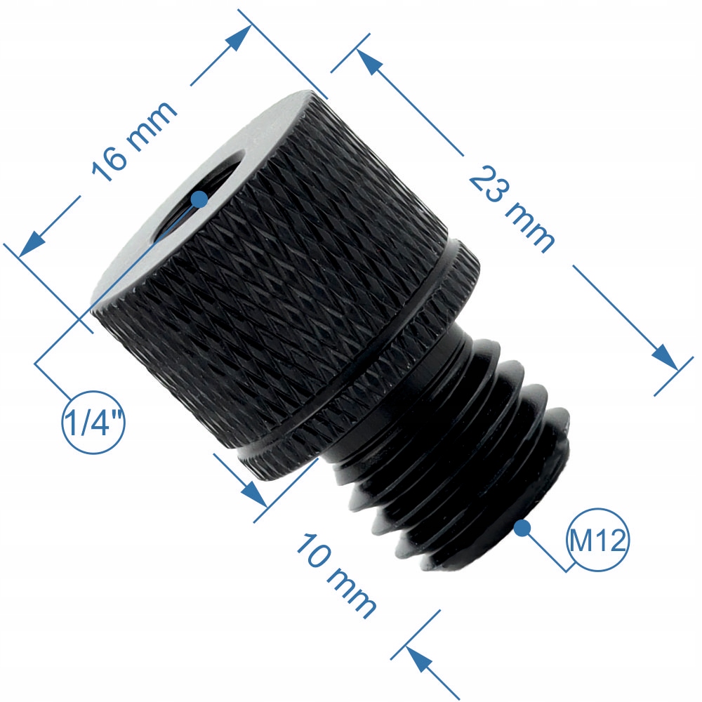 Aluminijast adapter M12 na 1/4" z narebričeno površino. Omogoča priključitev elementov z moškim M12 in notranji navoj 1/4" v fotografski, studijski in tehnični opremi.