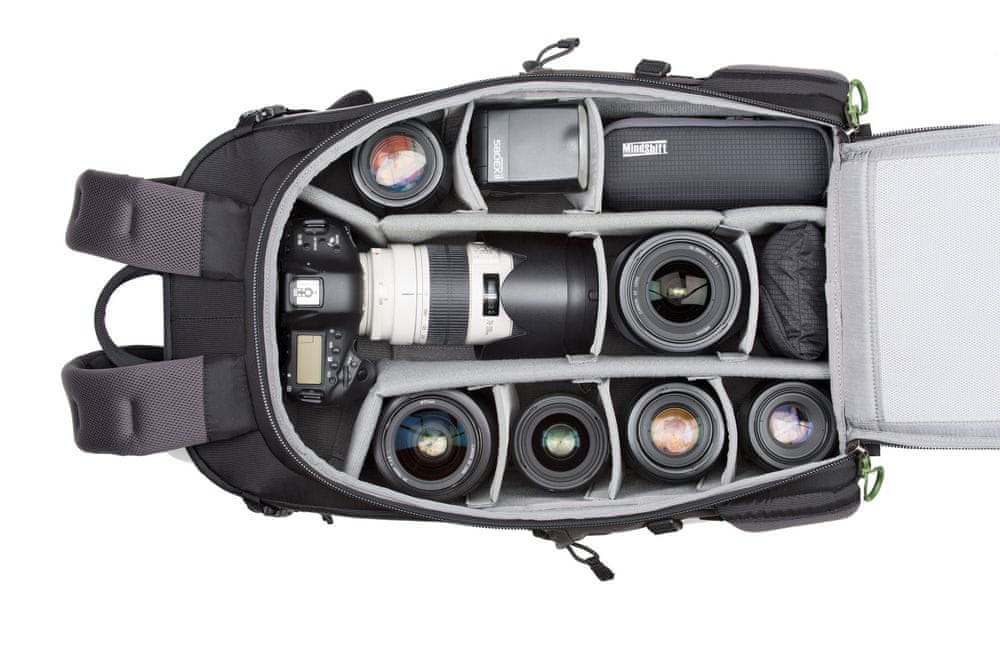 Pravi nahrbtnik za zahtevne fotografe – Backlight 36 znamke Mindshift! Nahrbtnik za fotoaparat se ponaša s prostornim predalom za fotoaparat in prav tako prostornim predalom za opremo za shranjevanje jakne, hrane, pohodniških vodnikov, pijače in še veliko več ter fotografske opreme. Izdelan je iz robustnega zunanjega materiala in ima dežno prevleko za zaščito vsebine. Predal za kamero Backlight 36 ima nastavljive, oblazinjene predelne stene iz pene za posamezno razdelitev prostora. Mindshift je pripravil odlično in varno rešitev za čim hitrejši dostop do vaše fotografske opreme – do predalčka za fotoaparat lahko dostopate prek zadnje plošče, tako da vam ni treba najprej odstraniti nahrbtnika. Različni zunanji predelki poskrbijo, da so majhni koščki pri roki in dobro organizirani. Hrbtna plošča AirMesh in oblazinjeni trakovi omogočajo udobno nošenje. Stativ ali pohodne palice lahko prenašate v priloženih držalih ali v kompresijskih trakovih na zunanji strani. Verige se lahko uporabljajo za pritrditev drugih delov opreme. Mindshift Backlight 36 ima impresiven dizajn, ki je bil premišljen do najmanjše podrobnosti za največji užitek pri fotografiranju na prostem!