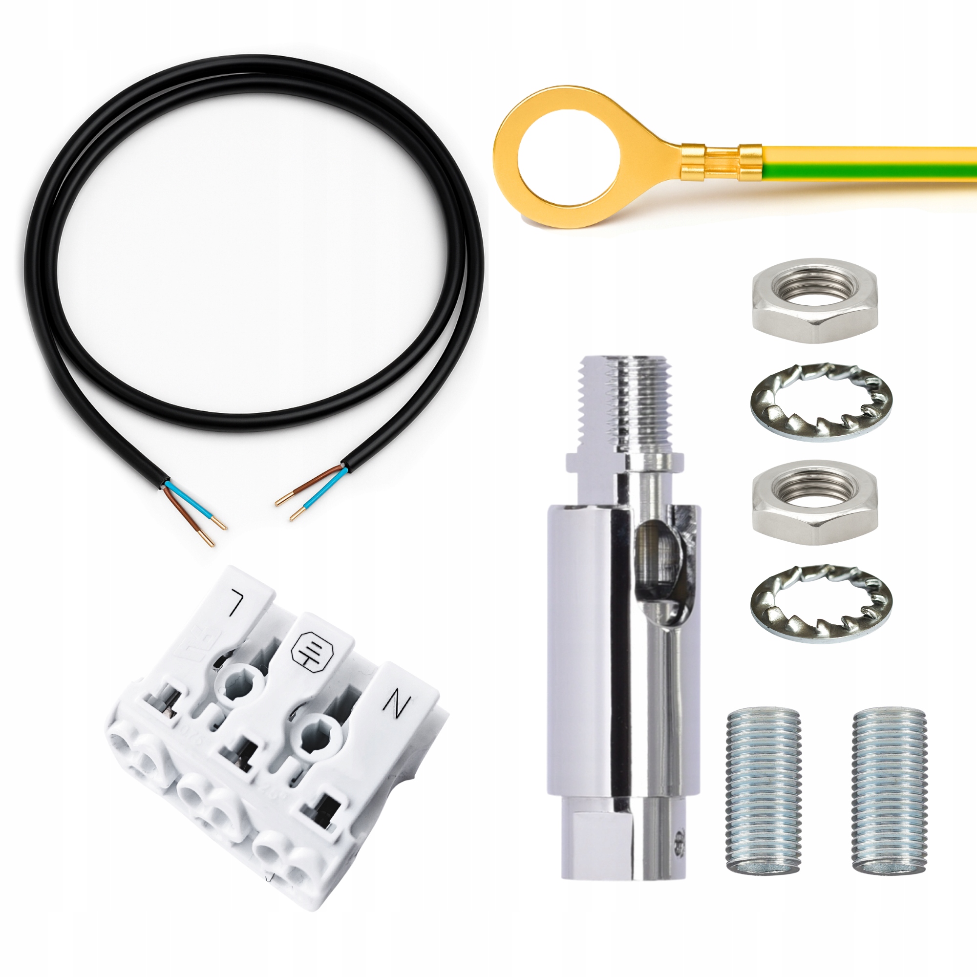 KOMPLET ZA IZDELAVO RAZSVETLJAVE: ŽICA 2X0,75 / BLOK / OZEMLJITEV / SPOJ / 2X KONTAKT 25 MM / 2X PODLOŽKA / 2X MATICA