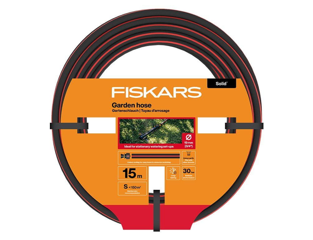 Fiskars SOLID. Z vzdrževanjem vodnega tlaka in pretoka zagotavlja največjo učinkovitost škropilnic in namakanja. Ima zanesljivo delovanje in dolgo življenjsko dobo ne glede na sezonsko uporabo. Barvno označevanje olajša izbiro hitrih priključkov. Univerzalni priključek je združljiv z drugimi blagovnimi znamkami. Dimenzije: premer 19 mm, 3/4 palca, dolžina 15 m. Številka dela Fiskars 1076061.