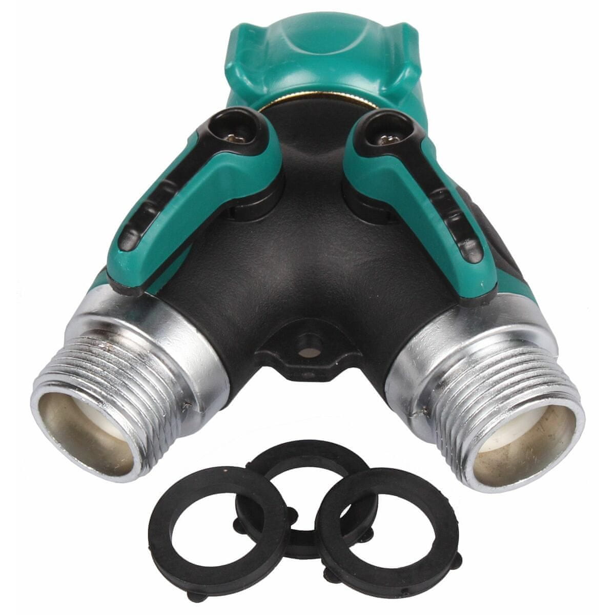 Priključek za razpršilno cev je praktično orodje, ki olajša delo ne le na vrtu. Z adapterjem za dvojno pipo lahko hkrati priključite dve cevi. Voda se nato uravnava z dvema ročicama na vrhu hitrega priključka. Razdelilnik meri 95 × 90 × 44 mm in je izdelan iz materiala PP. Priključek za vodo je izdelan iz bakra, prevlečenega z aluminijem, odtok vode pa je izdelan iz cinkove zlitine. Dimenzije notranjega navoja so ¾", zunanjega navoja pa 2 ¾". Navoji ustrezajo evropskemu standardu, zato je diverter prava izbira, če morate zalivati večjo površino vrta. V paketu sta vključena 1× hitra spojka in nadomestna gumijasta tesnila. Parametri: dimenzije: 95 × 90 × 44 mm dimenzije navoja: notranji navoj je ¾" cm, zunanji navoj je 2 ¾" cm. material: PP, baker, aluminij, cink teža: 170 g