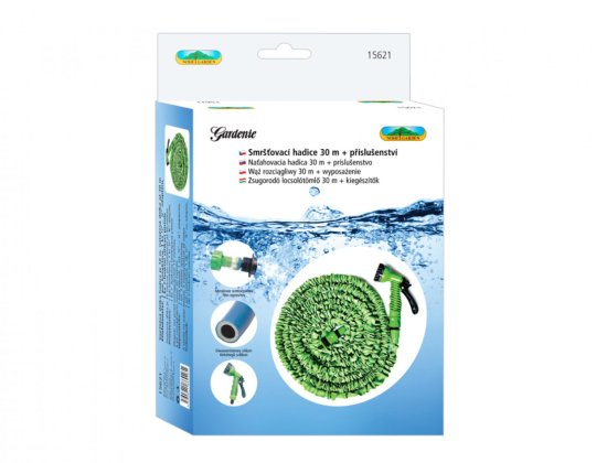 Set je sestavljen iz raztegljive cevi in dodatne opreme. Cev je dolga 10 metrov, raztegnjena pa 30 metrov. Material notranje cevi: dvojni lateks 6 × 9,5 mm, zunanja tkanina 600 × 600 poliester visoke trdnosti. Dodatki: 1 par priključkov, 1 kos 1/2"-3/4" adapterja, 1 kos pršilne pištole s 7 funkcijami.