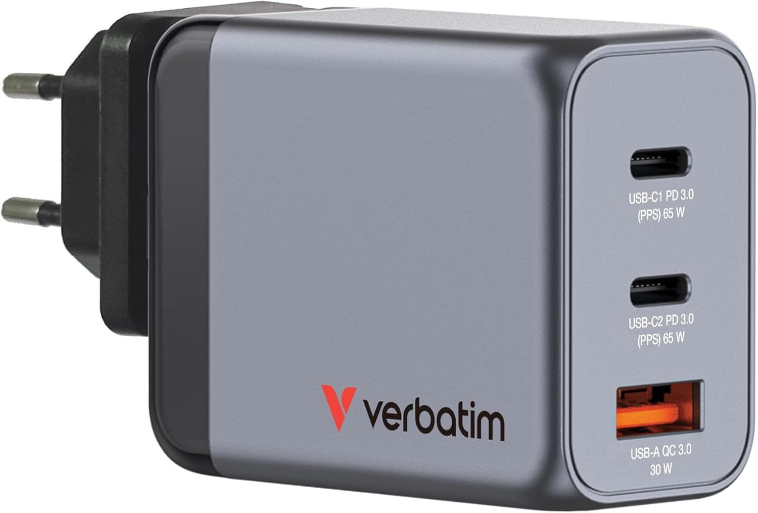 slomart Verbatim GaN polnilec 65W - 3 vrata (2x USB-C, 1x USB-A) - Hitro polnjenje za MacBook, prenosnik, iPad, iPhone, Samsung in več.