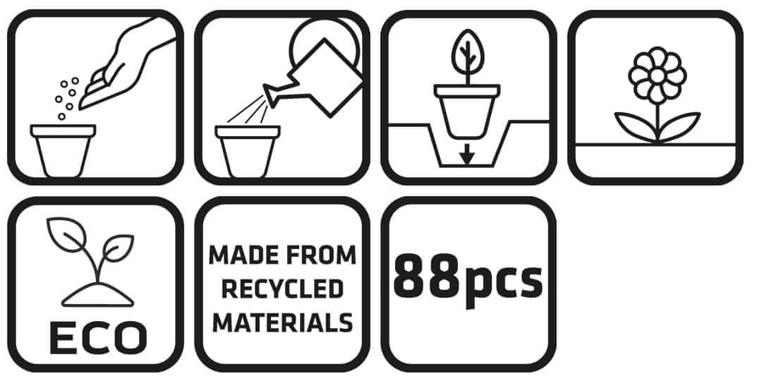 88-delni komplet za sajenje 15G467 VERTO Komplet vsebuje: 3 plastične pladnje (37,5 × 23,5 × 8,65 cm); biorazgradljive šotne gredice za sadike: 4 kosi za 10 rastlin (2 × 5 lukenj); 39 okroglih (premer 8 cm); 40 belih krožnikov/etiketov iz plastike; 1 kos majhnega orodja za quilling (plastika); 1 kos dvostranske lopatice (plastika).