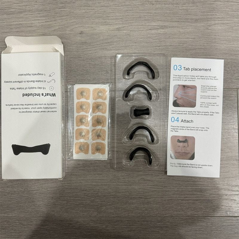 - Uporaba: Z magnetnim aplikatorjem namestite obliž, odstranite zaščitno folijo in nato obliž nežno namestite čez nos. Ponovite za drugo stran nosu.