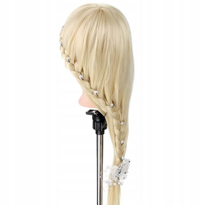 Głava za trening friziranja z blond lasmi, dolžine 70 cm, je idealna izbira za vse, ki se želijo izboljšati v različnih tehnikah friziranja. Ta profesionalna frizerska glava je izdelana iz kakovostnih sintetičnih vlaken (High Temperature Fiber – material PET), ki preprečujejo vozlanje las med stiliranjem. Vlakna so odporna na visoke temperature, kar omogoča varno kodranje z likalnikom za lase ali sušenje. Vendar je treba upoštevati, da sintetični lasje ne bodo tvorili kodrov, kot jih ustvarimo pri naravnih laseh.