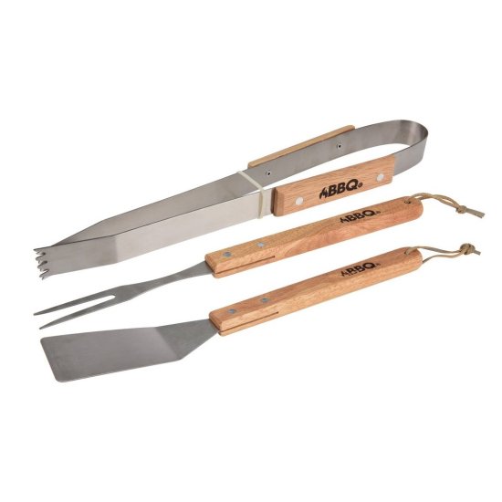 3-delni set pripomočkov za žar iz nerjavečega jekla in lesenimi ročaji. Garnituro sestavljajo klešče, vilice in lopatka.