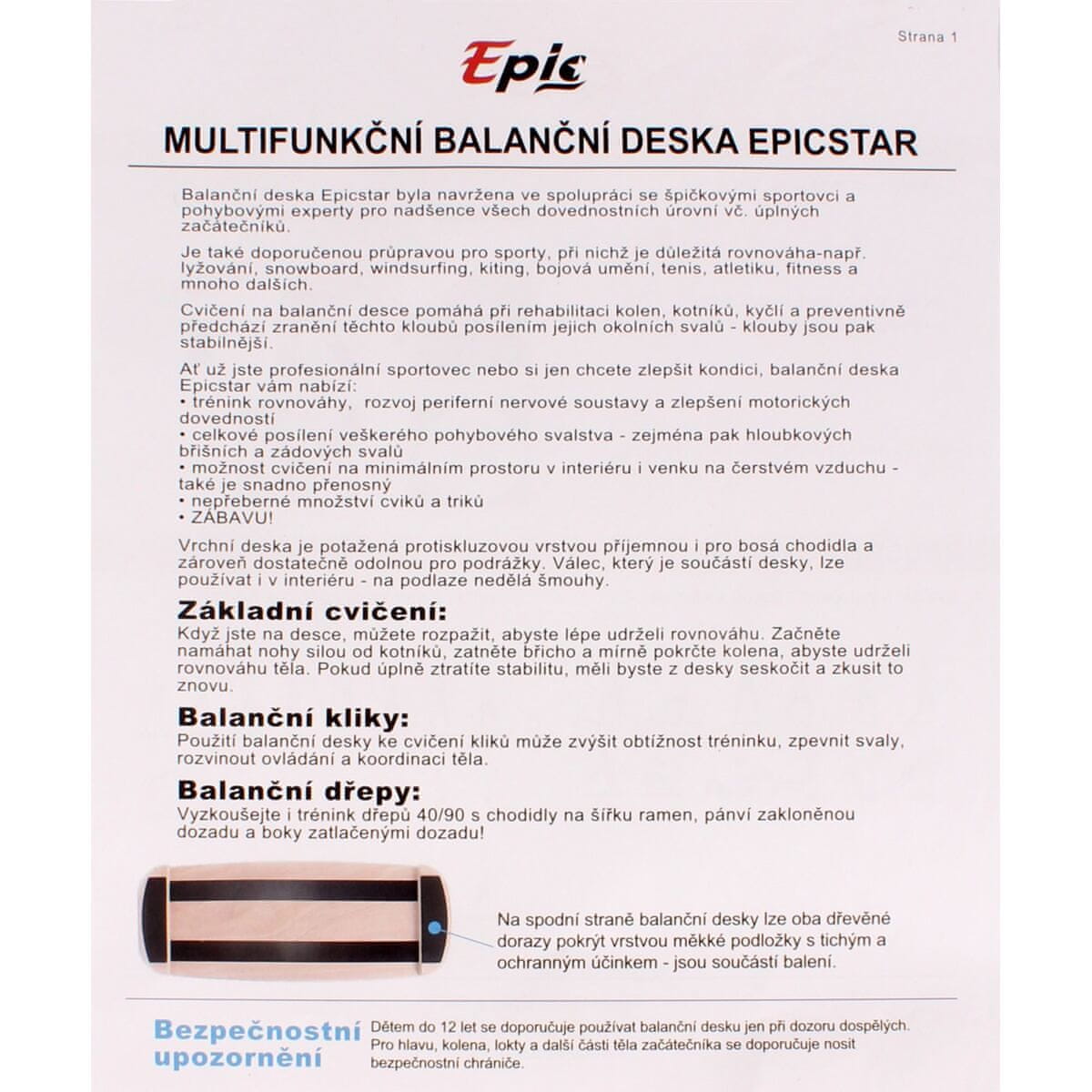 Multifunkcionalna ravnotežna deska Epicstar je rezultat sodelovanja z elitnimi športniki in strokovnjaki za gibanje. Idealna je za vse, od popolnih začetnikov do izkušenih športnikov. Je odličen pripomoček za športe, pri katerih je ravnotežje ključnega pomena – kot so smučanje, deskanje na snegu, jadranje na deski, kajtanje, borilne veščine, tenis, atletika, fitnes in številni drugich. Vadba na deski za ravnotežje Epicstar pomaga pri rehabilitaciji kolen, gležnjev, kolkov in preprečuje poškodbe teh sklepov, saj krepi okoliške mišice – sklepi postanejo bolj stabilni. Zgornji del deske za ravnotežje Epicstar je prevlečen z nedrsečo plastjo, ki je udobna za bosa stopala in dovolj trpežna za podplate. Valjček za ravnotežno desko Epicstar lahko uporabljate tudi v zaprtih prostorih, ne da bi za to potrebovali predpražnik. Za dodatno varnost je deska opremljena s končnimi omejevalniki spodaj, na katere lahko nalepite samolepilne mehke blazinice za dodatno zaščito tal. Vključena je ojačevalna palica z gumijastimi razširitvami, sidro za vrata in sidrna zanka za k. Gre je sodobno orodje za fitnes, ki omogoča sistematično krepitev vseh mišičnih delov. Ekspanzerji za krepitev so odlično vsestransko orodje za krepitev in raztezanje mišic ter za povečanje učinkovitosti med razteznimi vajami. Gumo lahko uporabljate tako za vadbo za moč z lastno težo kot tudi za vadbo vzdržljivosti. V tem kompletu so na voljo trije pari ekspanderjev z različnimi stopnjami odpornosti. Sidro za vrata razširja uporabo odpornih gum. Tako lahko trenirate skoraj na enak način kot na sistemu za vzmetenje. Sidrni valjček potegnete skozi vrata, tako da se vrata z vlekom zaprejo, lahko pa ga namestite ob tečaj vrat. S priloženo karabinko vpnete raztezalo v zanko valja. Tako lahko krepite vsako stran telesa posebej in se bolje osredotočite na pravilno izvajanje vaj. – Paket vključuje torbo za lažje prenašanje in shranjevanje – največja nosilnost: 150 kg – velikost plošče: 73,5 × 26,5/28,5 × 2 cm (dolžina x širina ob robu/širina v sredini x debelina) – velikost valja: 10,5 cm x 41,5 cm (premer x dolžina) – teža plošče: 2,35 kg – teža valja: Vrhnji del: 1,2 kg – valj je prevlečen z mehkim filcem – na trdi površini ne potrebuje podloge – na spodnji strani ravnotežne plošče lahko oba lesena omejevalnika prekrijete s plastjo mehke podloge s tihim in zaščitnim učinkom – priloženo – gumijasti ekspanzerji so barvno označeni glede na velikost upora – vratno sidro je majhen, lahek pripomoček za pritrditev vadbenih ekspanzerjev – zanka za pritrditev na spodnjo ali zgornjo okončino – priporočena starost: 9+