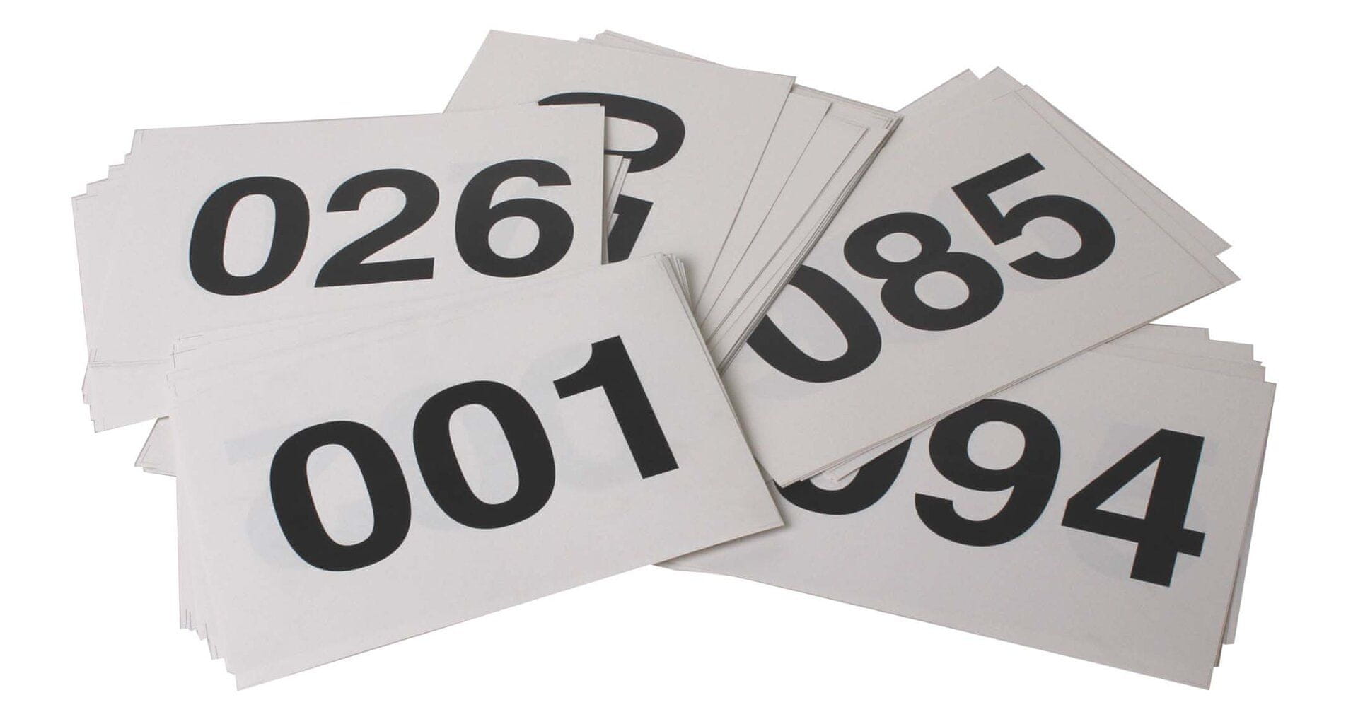 Črne začetne številke (1–100) so natisnjene na belem nelepljivem papirju velikosti 20 × 14 cm. Številke so trimestne in dovolj velike, da jih je mogoče jasno razločiti.