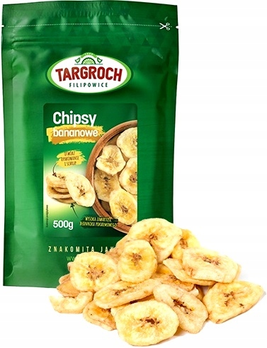 Opis: Sušene banane in bananin čips v 1000 g vrečki, ki jo je mogoče ponovno zapreti, znamke Targroch. Narezani na čips velikosti navadnega čipsa. Zdrav, visokokaloričen prigrizek, ki vsebuje serotonin, ki je pomemben za telo. Priporočljivi so za športnike, saj so odlično dopolnilo za nadomeščanje energijskih pomanjkanj.