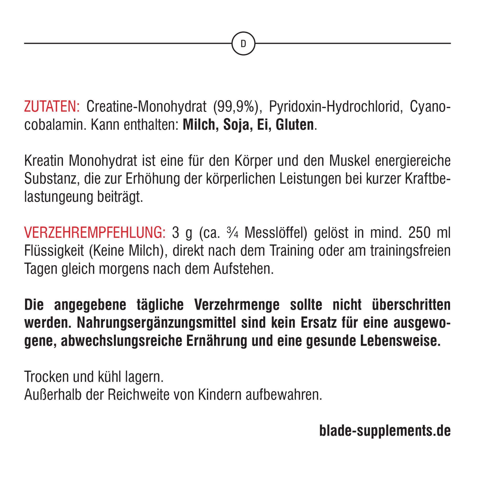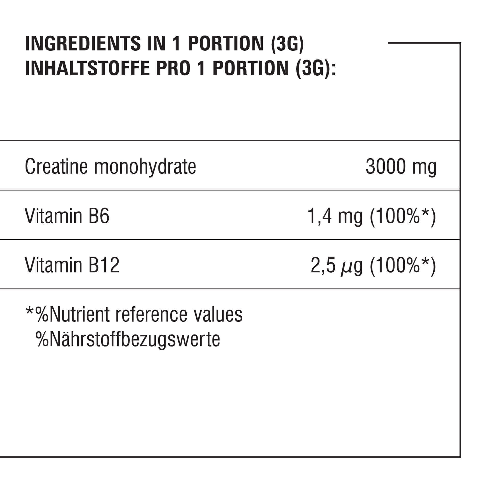 Kreatin monohidrat (99,9 %), vitamin B6 (piridoksin hidroklorid), vitamin B12 (cianokobalamin).