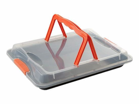 Jeklena pločevina s površino, ki se ne prijema. Dimenzije 42 × 29 × 4 cm, debelina lista 0,5 mm. Plastični pokrov s transportnimi ročaji. Pokrov ni namenjen toplotnim obremenitvam, tj. peki, niti vročim pekačem!!! EAN 5901468247813