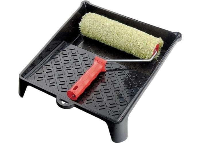 V kompletu je priročen pladenj, ki omogoča enakomeren nanos materiala na valjček in ekonomično porabo .