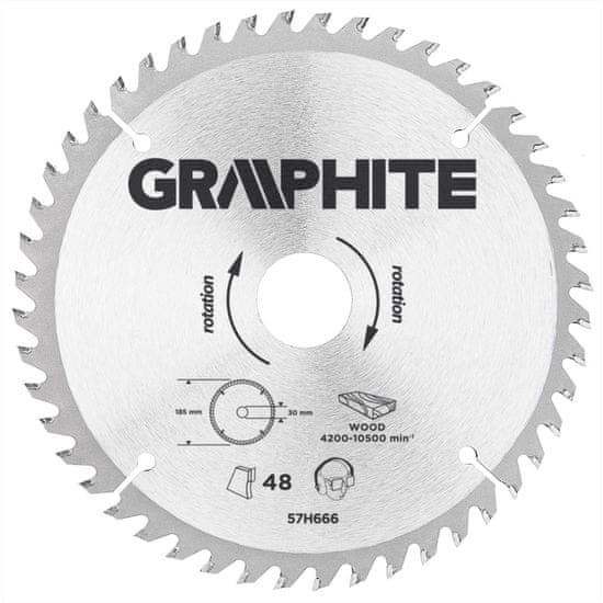 List krožne žage iz karbidne trdine GRAPHITE (ref. št. 57H666) z zunanjim premerom 185 mm, izdelan iz zlitine manganovega jekla MN65 z visoko odpornostjo na temperaturo in deformacijo. Zobje s konico iz karbidne trdine YG6A omogočajo natančno rezanje lesa in materialov na osnovi lesa, kot so vezane plošče, iverne plošče, MDF. Reducirni obročki, ki so vključeni v paket, omogočajo uporabo rezila z večino modelov žag.