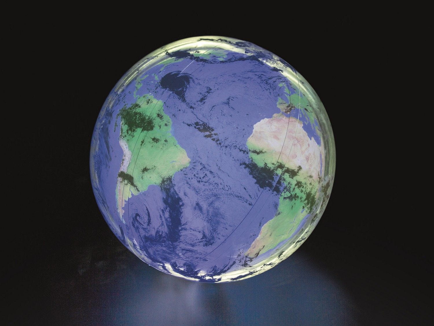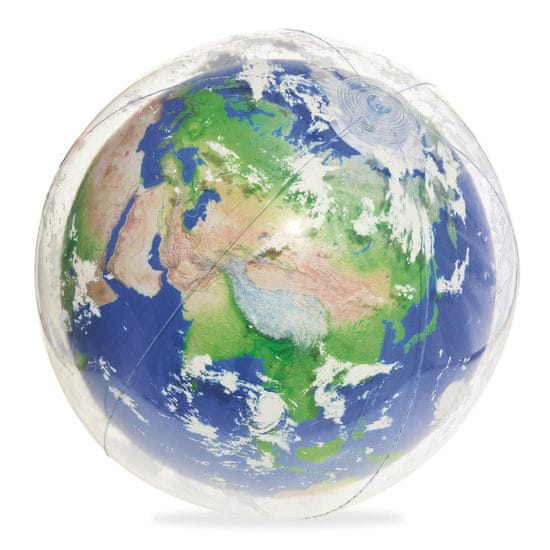 Žoga ima dve zračni komori: notranja z grafiko globusa in prozorna zunanja s poslikanimi oblaki, ki posnemajo Zemljino atmosfero. Ko žogo stresete, začne svetiti z vgrajeno LED osvetlitvijo, kar bo očaralo otroke in poskrbelo za dodatno zabavo tudi ob večernih igrah.