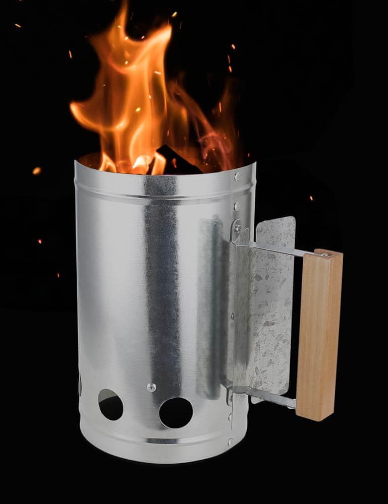 S tem zažigalnikom lahko udobno in hitro prižgete oglje ali brikete Zažigalnik pospešuje ogenj do 30 minut in je primeren za vsak žar na oglje ali brikete. Začetni del dimnika je izdelan iz visokokakovostnega pocinkanega jekla. Na ročaju je zaščita za roke, ki preprečuje opekline. Lesen ročaj zagotavlja udoben oprijem in izolacijo pred vročim zrakom.