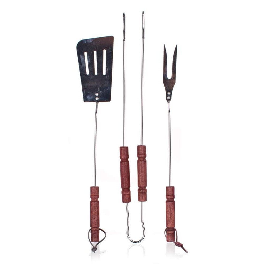 tridelni komplet pripomočkov za žar vključuje klešče, obračalnik in vilice iz kromiranega jekla. Ročaj je izdelan iz lesa. Komplet vsebuje osnovna orodja, potrebna za peko na žaru. Orodje je opremljeno z zanko za obešanje. Celoten opis
