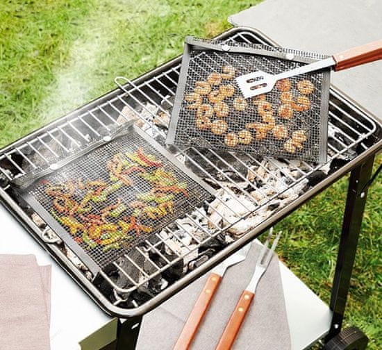 Set dveh mrežastih vrečk za žar, kot nalašč za peko zelenjave in drugih majhnih živilskih predmetov, ne da bi se zlepili ali padli v plamen in sežgali. So zelo praktični in enostavni za uporabo, hrano preprosto položite v vrečke in jih odložite na žar (nikoli ne neposredno na plamen). Živila se kuhajo bolje in imajo boljši okus, saj dim prehaja skozi mrežo. Preprosto obrnite vrečke za kuhanje na drugo stran. Živila se v vrečah ne razpršijo in ne padejo v ogenj med kuhanjem, in ko so kuhane, jih je mogoče enostavno odstraniti s pomočjo protilepka. Vrečke so tudi enostavne za čiščenje v pomivalnem stroju. Bolj higienski in učinkovit način kuhanja hrane na žaru.