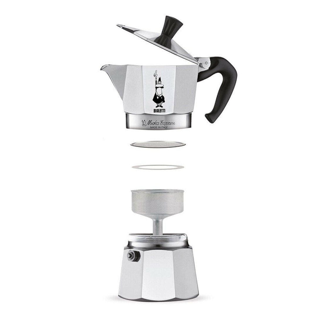 BIALETTI KAFETIERA MOKA EXPRESS v nekaj minutah proizvede bogat, pristen espresso za 6 skodelic. Aluminijasta posoda ima značilno osemkotno obliko, ki omogoča popolno razpršitev toplote, kar izboljša aromo vaše kave. Kafetiero lahko uporabite na plinskih, električnih in keramičnih kuhalnih površinah. Ni primerna za indukcijo in pomivanje v pomivalnem stroju.
