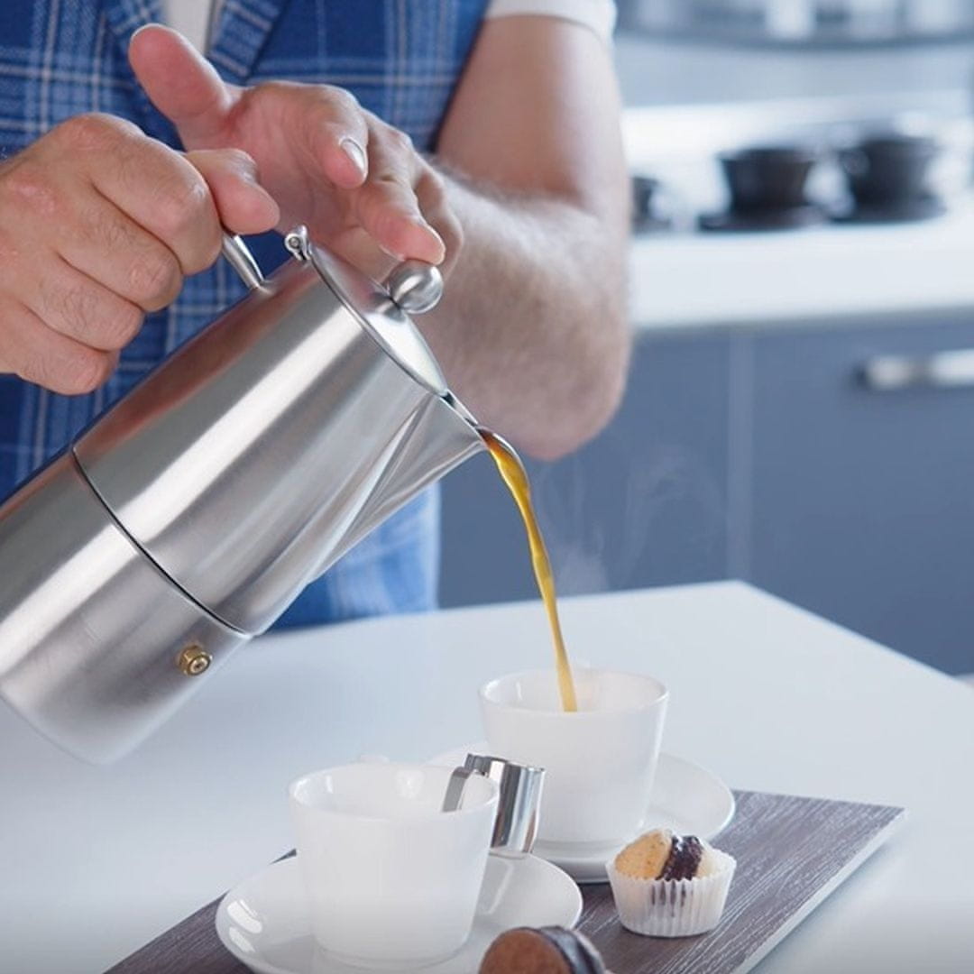 Ilsa Slancio kafetiera z izvirnim dizajnom je lahko odlična ideja za darilo za vse ljubitelje prave italijanske kave. Izdelana je iz satininranega nerjavečega jekla 18/10, njeno dno pa je primerno tudi za indukcijsko kuhalno površino. Kafetiera Slancio ima eleganten sodoben dizajn, ergonomski ročaj in izliv proti kapljanju za čisto in natančno nalivanje. Kafetiera se ponaša z ročajem in pokrovom na ročaju, ki se ne segrevata ter redukcijskim filtrom za zmanjšanje količine pripravljene kave. Primerna je za serviranje 6 skodelic ali manj. Pomijte jo ročno.