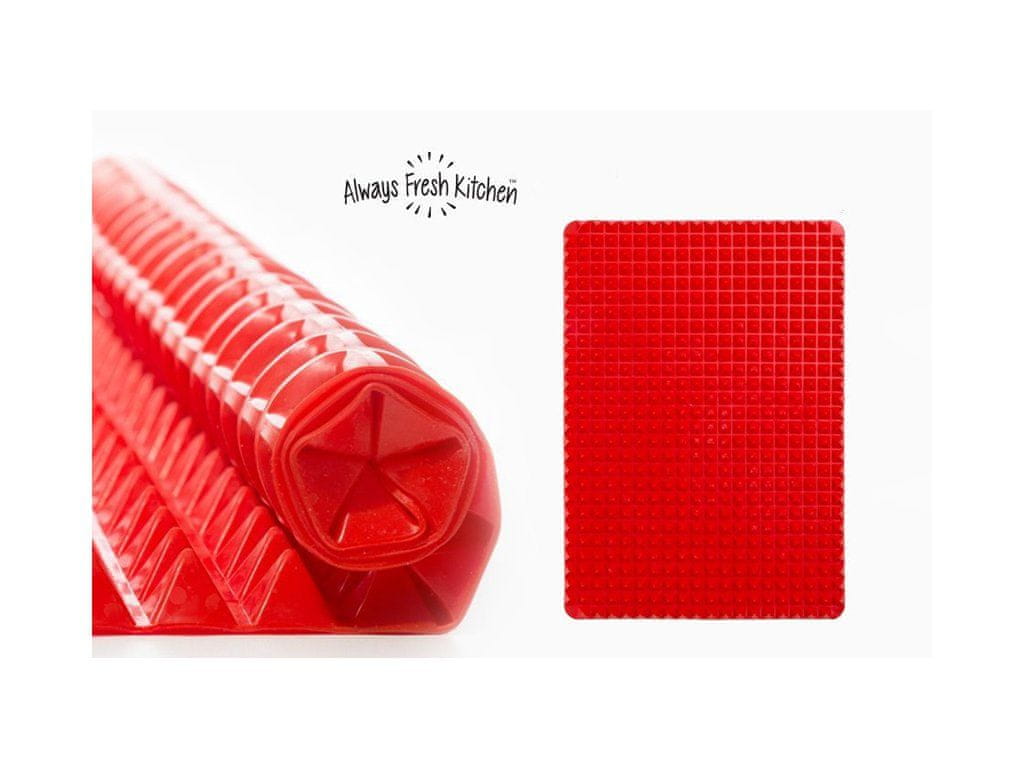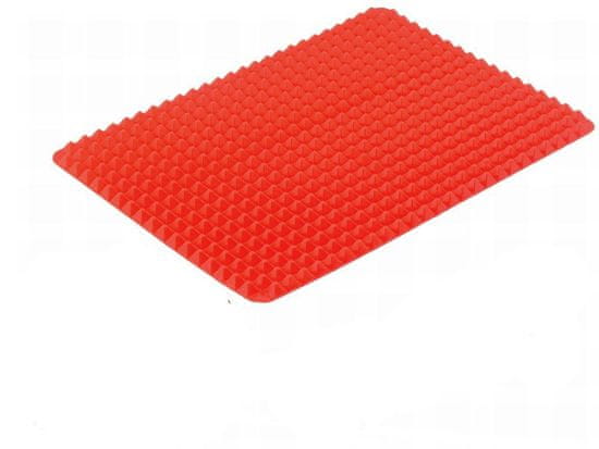 Pyramid Pan – prebojna novost v domači peki z nizko vsebnostjo maščob! Ne boste več potrebovali papirja za peko ali količine olja. Silikonska blazinica, ki jo preprosto položite na pekač, zloži zahtevane sestavine, jo začini in postavi v pečico. Posebna oblika preproge iz silikonskih piramid zagotavlja popolno peko hrane z vseh strani. Vaše dobrote bodo sočne, hrustljave in odvečna maščoba bo ostala pod njimi, ne da bi v njih plavala ali se namakala.Odvečna maščoba preprosto kapne v reže med piramidami in jo po peki vliješ v posodo z zažganim oljem. Blazinica je odporna na toploto do 220 ° C – zelo primerna kot blazinica pod vročim loncem, posodo itd. Po uporabi ga zvijete in shranite v omari – prihrani prostor. Lahko ga enostavno operete v topli vodi, vendar je tudi maksimalno primeren za pomivalni stroj.