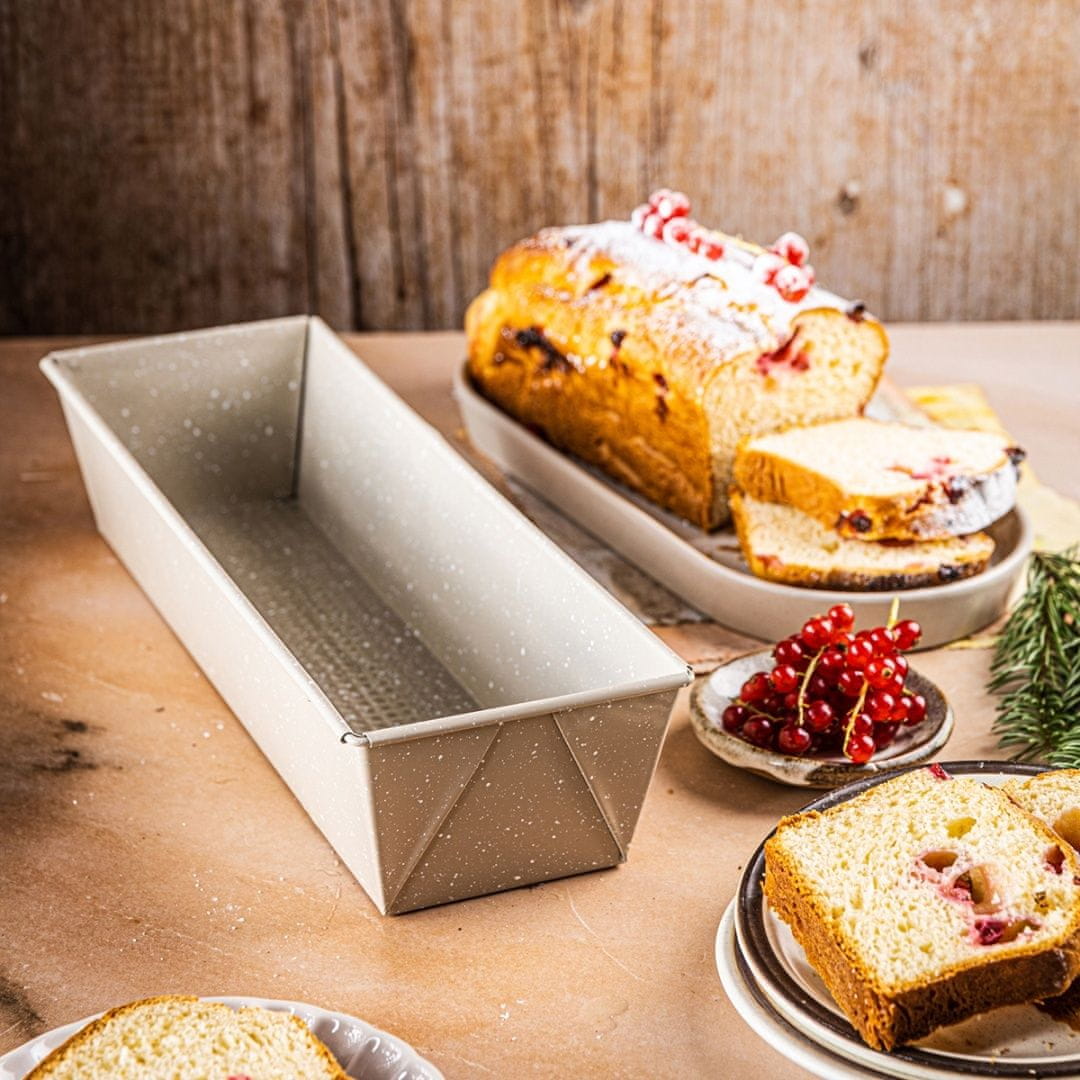 Dno pekača ima nežno teksturirano strukturo , ki spodbuja boljše sproščanje pare in zmanjšuje tveganje za nabiranje saj. Zaradi velike velikosti 35 × 11,5 × 7,5 cm je pekač za kruh odličen ne le za klasične hlebce, temveč tudi za domač kruh, paštete, pecivo s kvasom in bananin kruh.