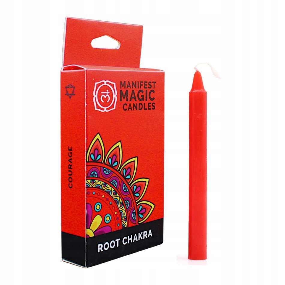 Edinstvena rdeča sojina ritualna sveča posvečena korenski čakri, znani tudi kot Muladhara. To je eden od izdelkov iz kompleta Manifest Magical Candles, idealen za meditacijo, sprostitev in magične rituale.