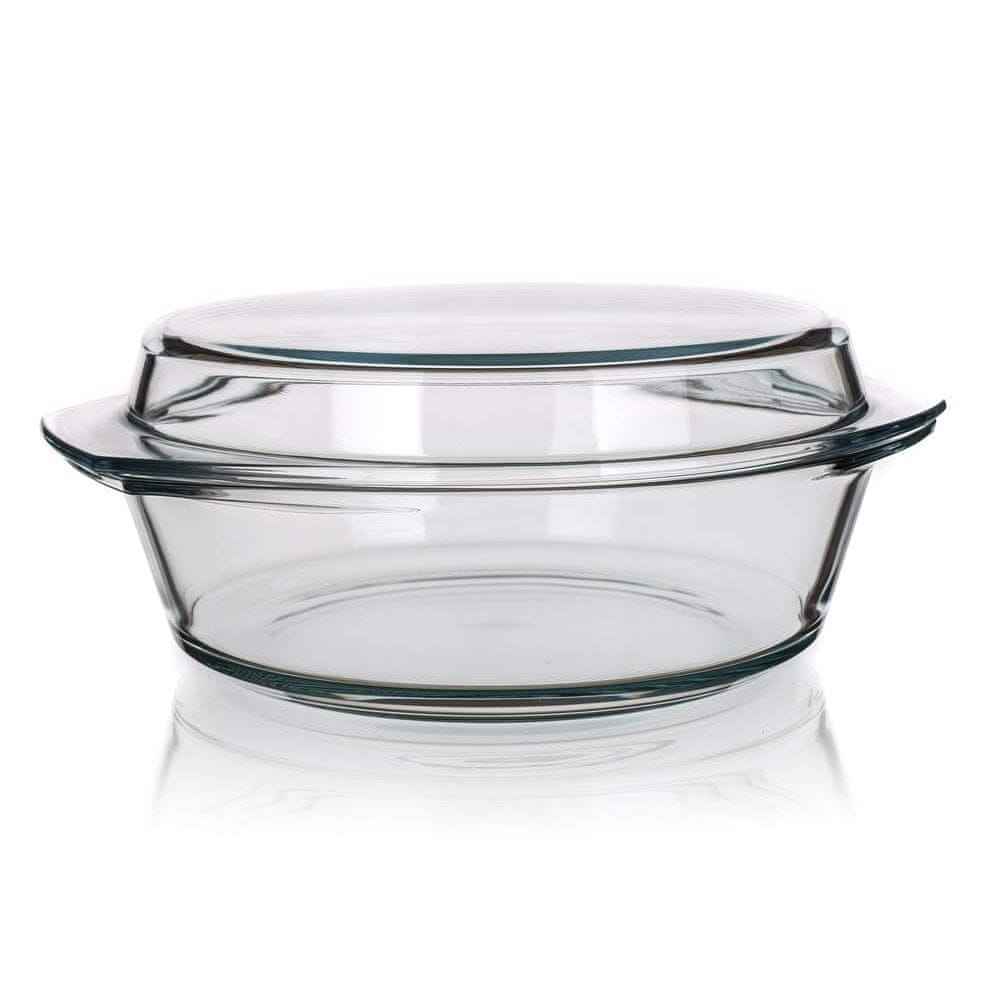 Okrogla posoda za peko s pokrovom s prostornino 2,1 l je izdelana iz trdega borosilikatnega stekla, ki je mehansko in toplotno zelo odporno (odpornost +300 / –40 stopinj). Prednost je dolga življenjska doba, higienska varnost in enostavno vzdrževanje (lahko se pomiva v pomivalnem stroju).
