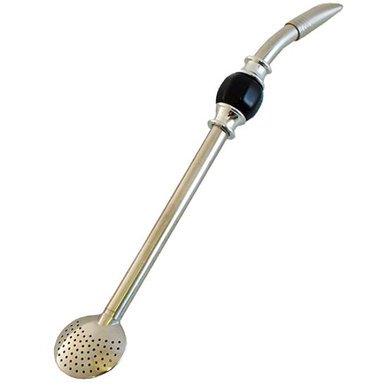 Kovinska bombilla z ravnim cedilom in obročem. Bombilla je slamica za pitje tradicionalnega južnoameriškega čaja Mate. Z njim kislo kumarico odcedimo od listov.