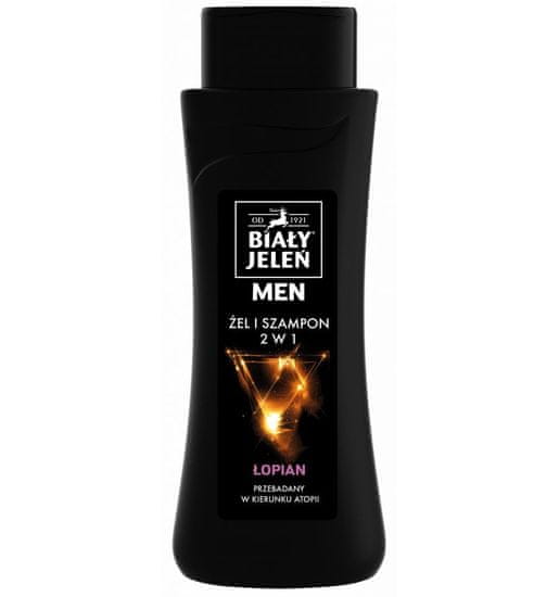 Hipoalergeni šampon in gel Biały Jeleń 2 v 1 za moške z repincem in pšeničnimi beljakovinami čisti, krepi in neguje kožo ter lasem vrača vitalnost. Primeren za vse tipe kože in za normalne do mastne lase.